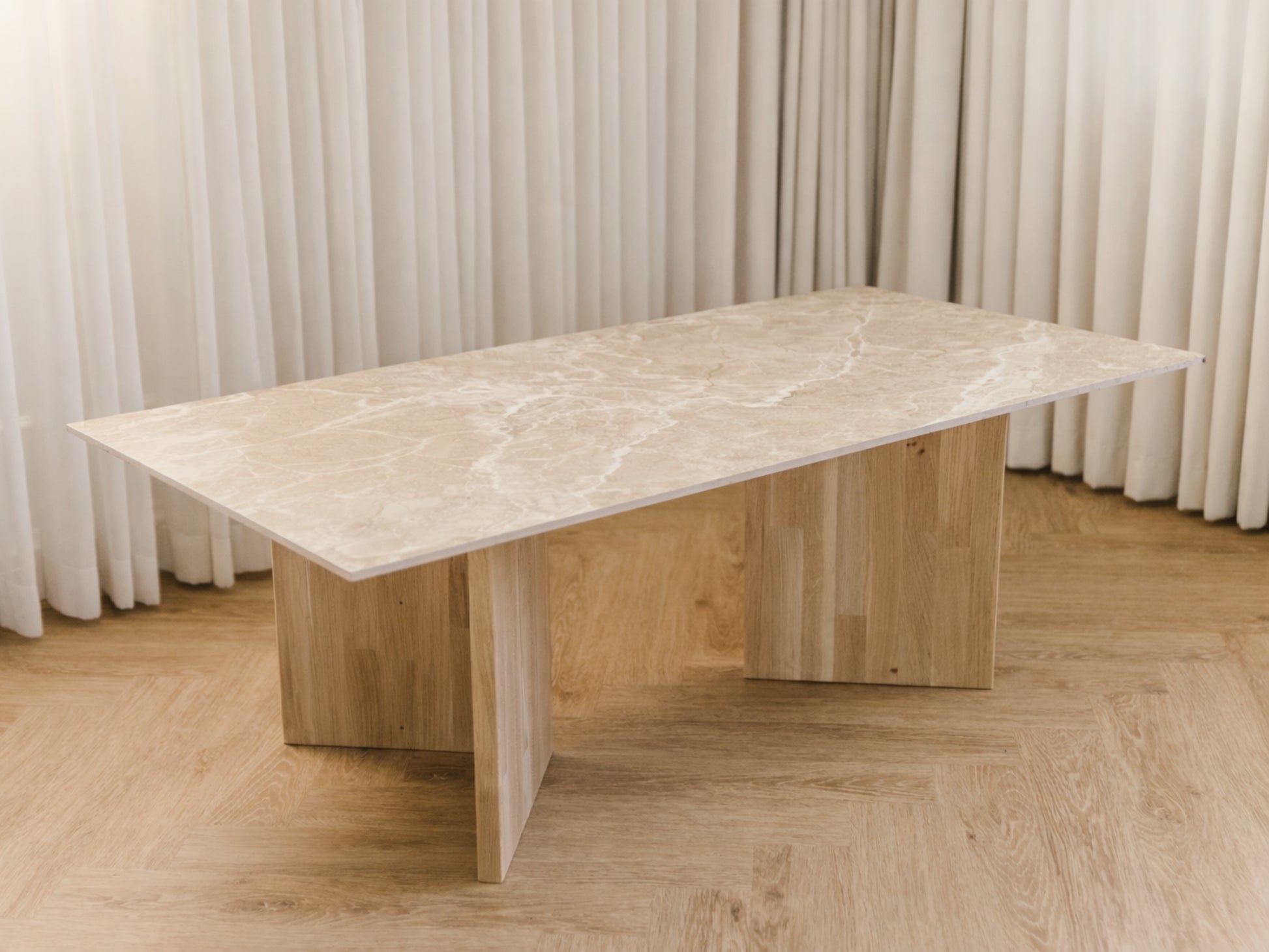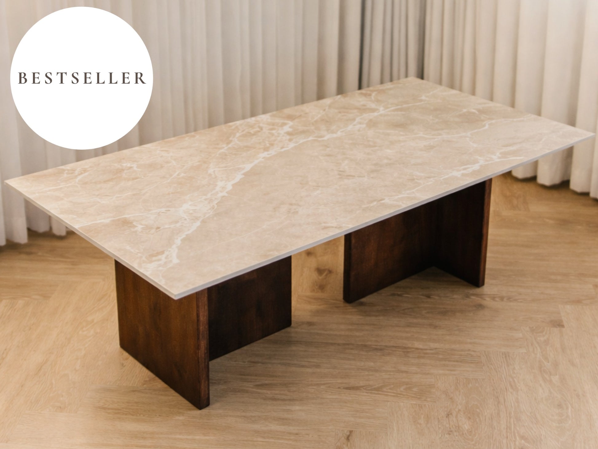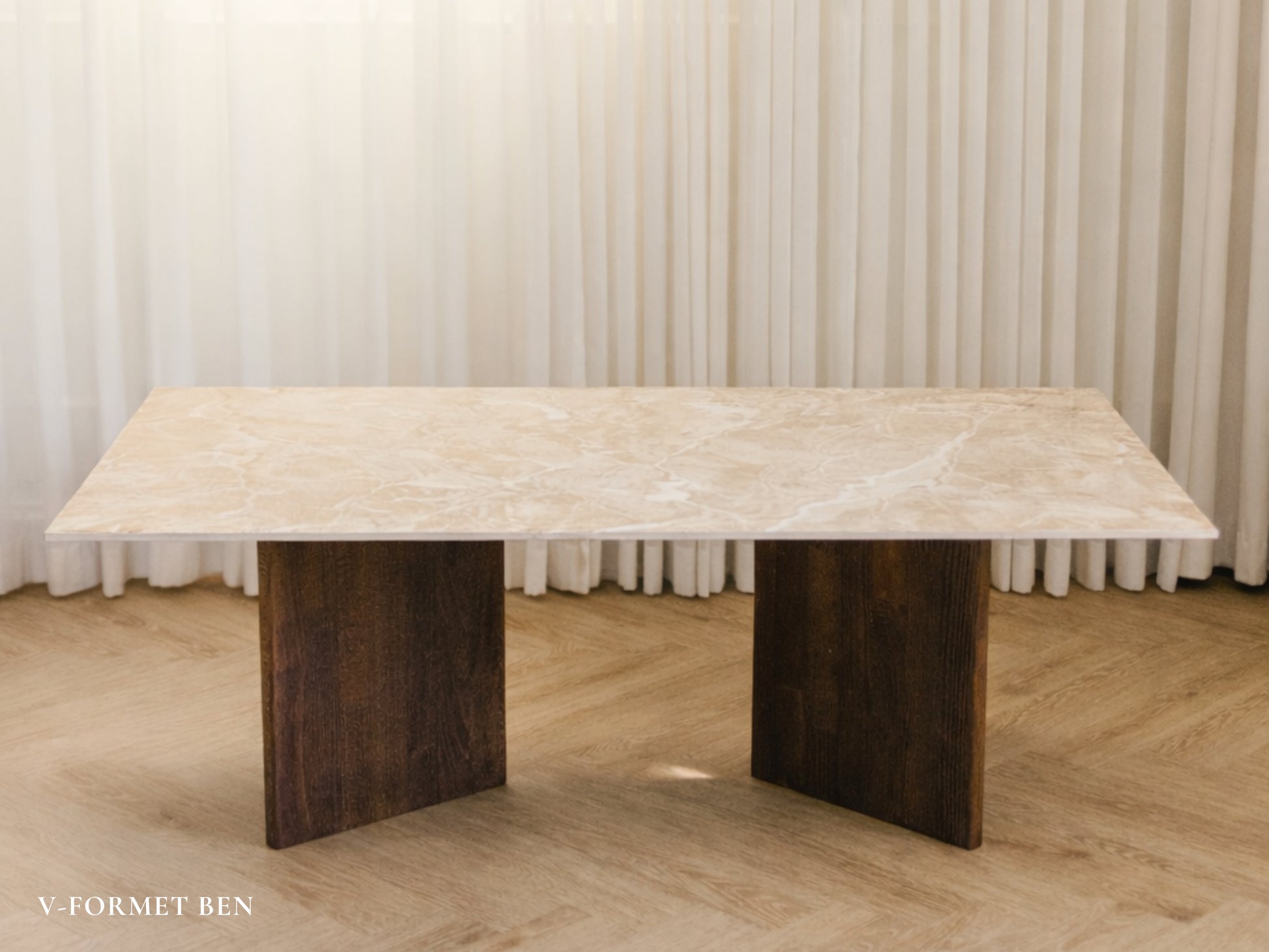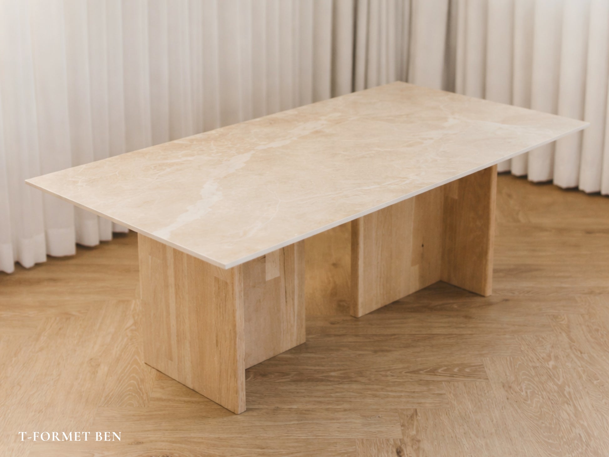 Bordpladen er en luksuriøs italiensk keramisk klinke, der emmer af elegance og holdbarhed, mens benene er håndlavet i massivt træ og fås i forskellige træsorter.