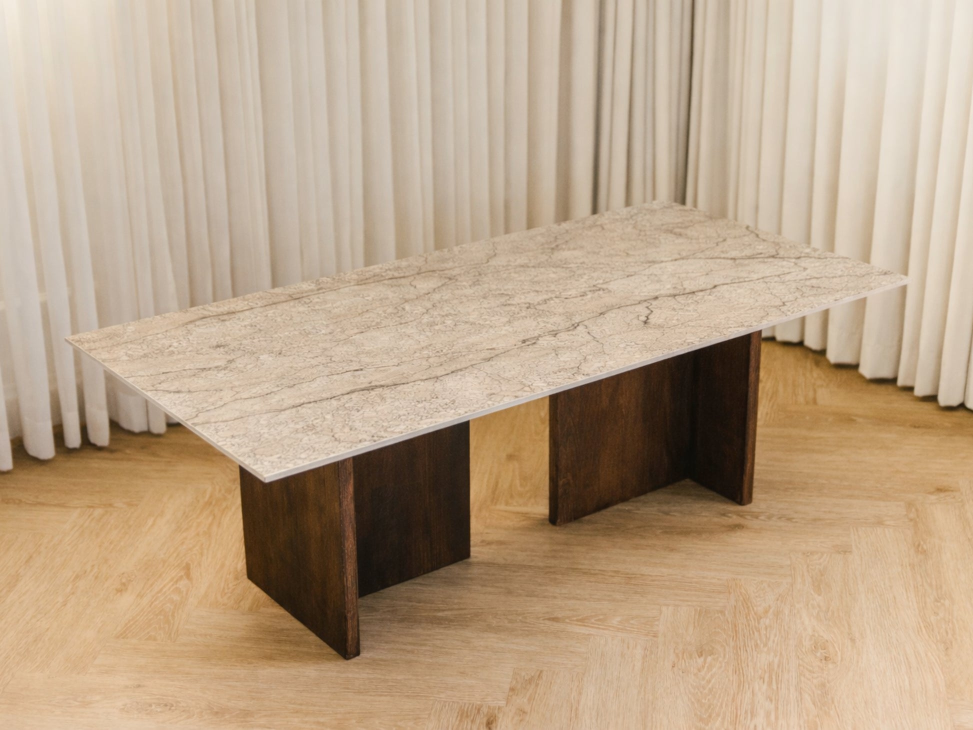 Bordpladen er en luksuriøs italiensk keramisk klinke, der emmer af elegance og holdbarhed, mens benene er håndlavet i massiv bøg som har fået en mørk olie.